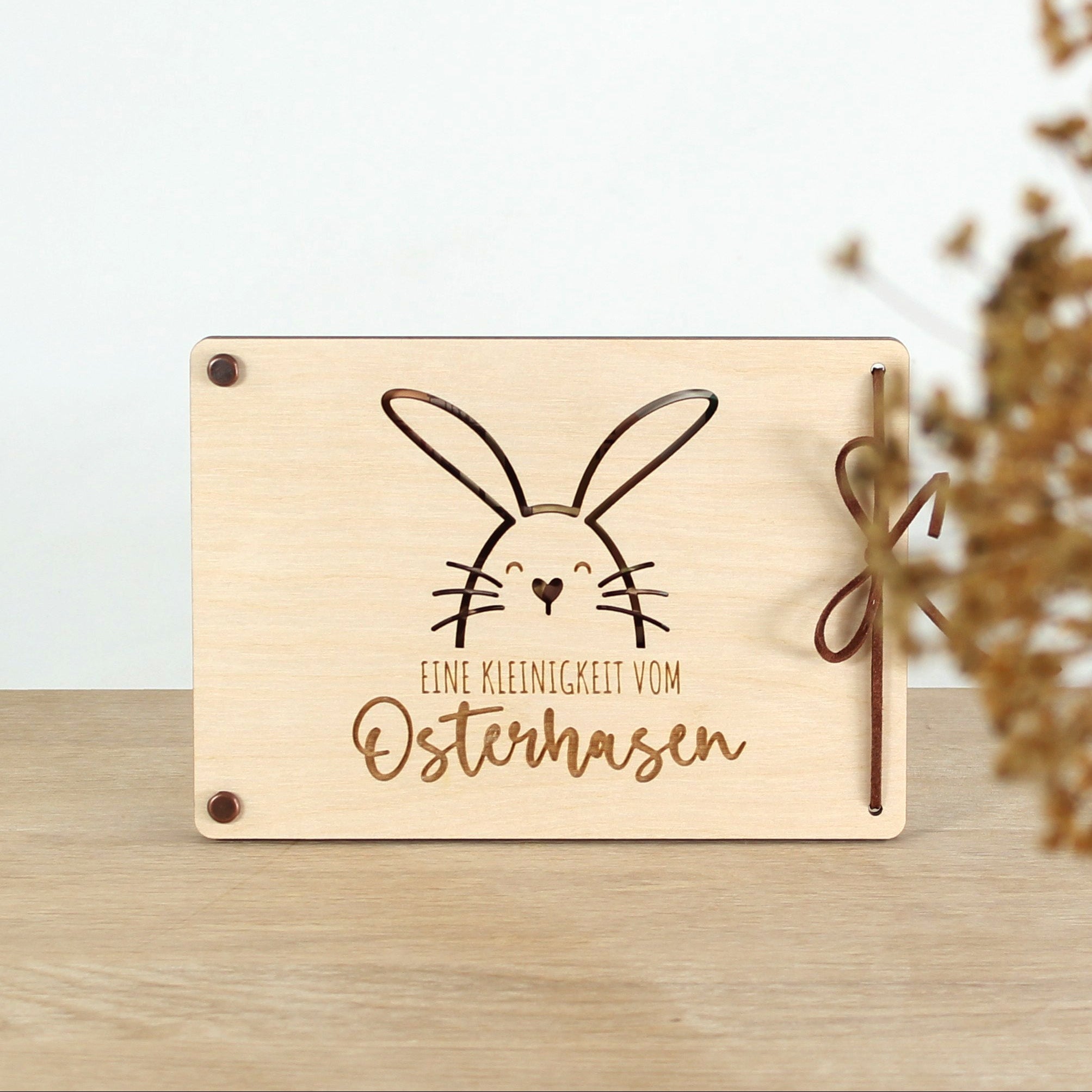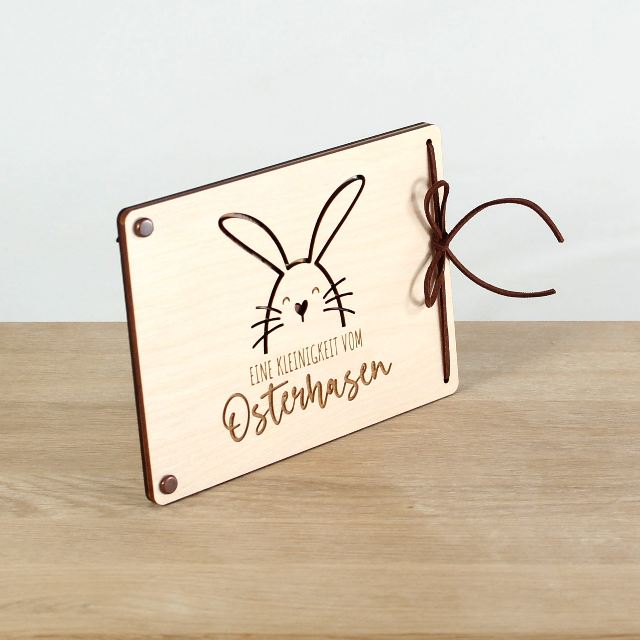 Mach dein Ostergeschenk zu etwas ganz Besonderem! Unsere liebevoll gestaltete Geschenkverpackung aus Holz mit ausgelasertem Hasenkopf-Motiv ist eine originelle und nachhaltige Möglichkeit, Geld oder Gutscheine zu verschenken.