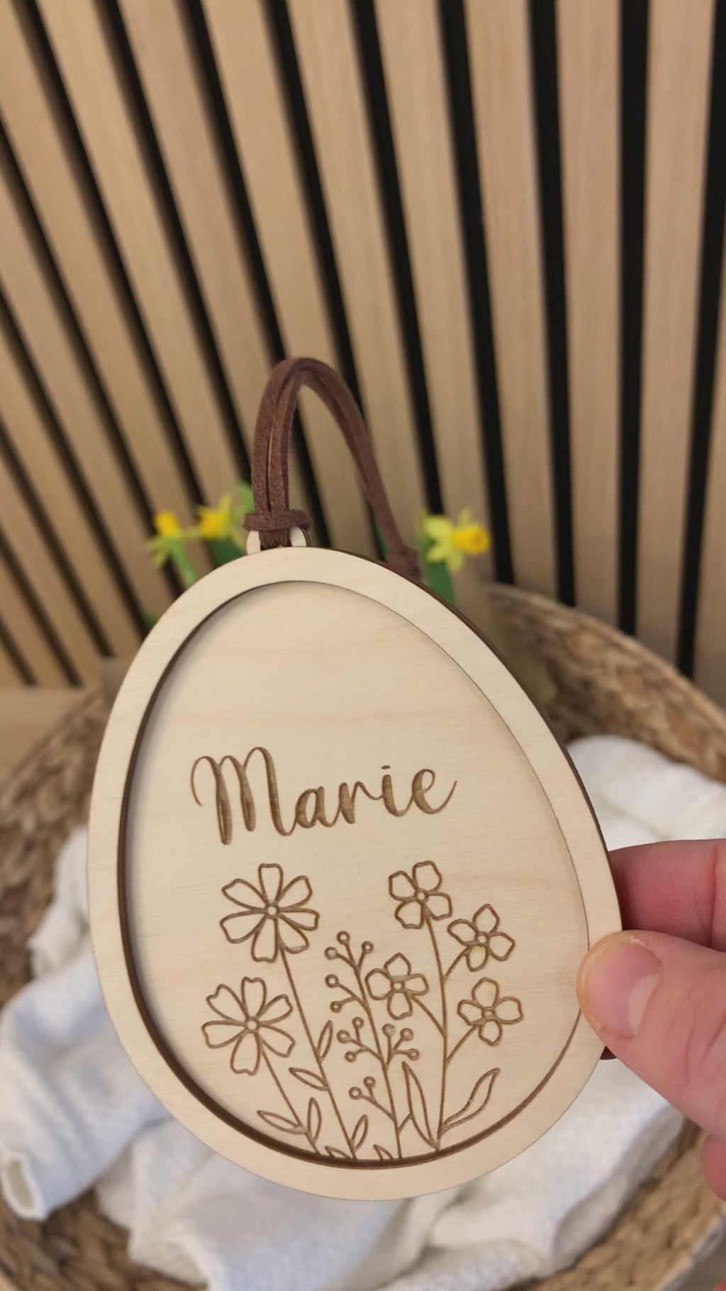 Dieser personalisierte Osteranhänger aus Holz in Osterei-Form begeistert mit einer filigranen Blumenillustration und einem dezenten Rahmen. Der individuell gelaserte Name macht jedes Stück zu einem einzigartigen Unikat – perfekt für den Osterstrauch, das Osterkörbchen oder als liebevolle Aufmerksamkeit zu Ostern.