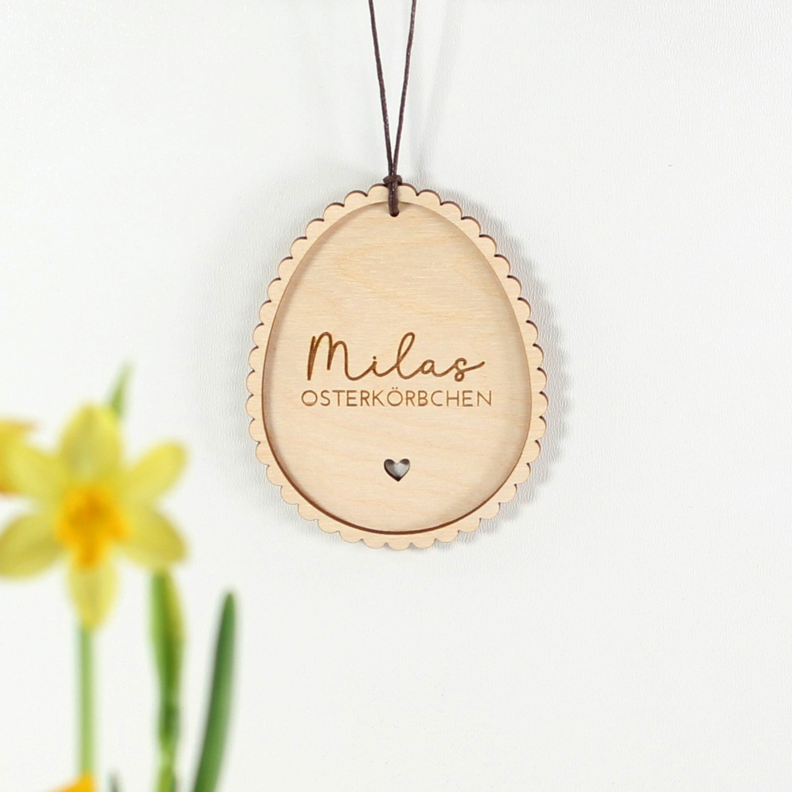 Dieser personalisierte Anhänger aus Holz verleiht jedem Osterkörbchen einen ganz besonderen Charme. Der niedliche Rüschenrand und der individuell gelaserte Name machen ihn zu einem einzigartigen Unikat. Perfekt für ein liebevolles Ostergeschenk, das lange in Erinnerung bleibt.